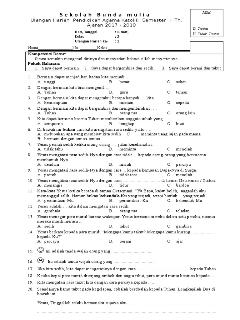 Kalimati RT012RW010 Gelam Jaya Pasar Ke. Soal UAS Pendidikan Agama Katolik Kelas 7 8 9 Semester 1 Tahun 20172018 ini merupakan file terbaru yang bisa anda dapatkan dalam postingan saya kali ini. Pilihlah huruf A B C atau D sebagai jawaban yang paling benar.