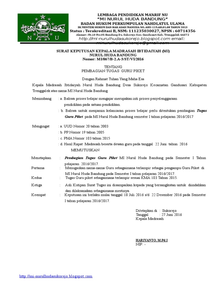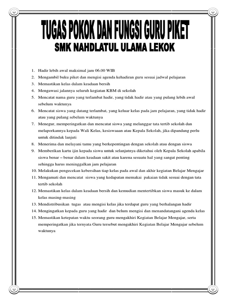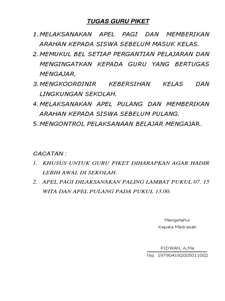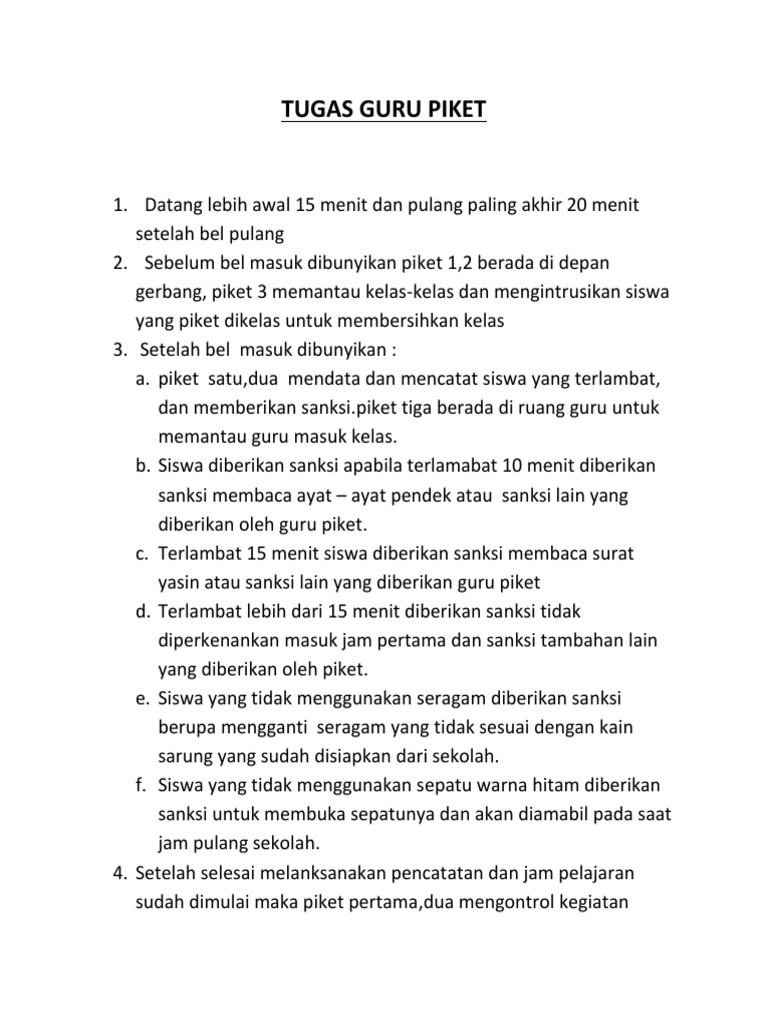 Adanya guru piket di sekolah tentunya sangat Penting. Keputusan Kepala SMP Muhammadiyah 29 Sawangan Kota Depok tentang Pembagian tugas guru piket tahun pelajaran 20132014 PEMBAGIAN TUGAS GURU PIKET TAHUN PELAJARAN 20132014 NO NAMA HARI 1 TASMIYAH SENIN 2 SYAIFUL KURNIAWAN SKM. Tugas pokok dan fungsi tupoksi guru piket Meningkatkan pelaksanaan 9 K keamanan kebersihan ketertiban keindahan kekeluargaan kerindangan kesehatan keteladanan dan keterbukaan.
